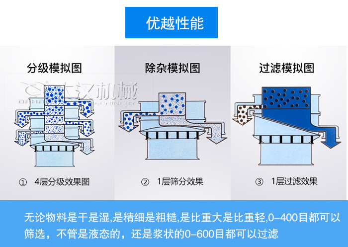我們的不銹鋼旋振篩采用"強(qiáng)力"新型動力激振器,三維動力更加突出,無論物料是干是濕,是精細(xì)是粗糙,是比重大是比重輕,0-400目都可以篩選,不管是液態(tài)的,還是漿狀的0-600目都可以過濾,旋振篩系列產(chǎn)品同時配備專門的篩網(wǎng)清理裝置,把堵網(wǎng)率降到低,我們還可根據(jù)客戶需求設(shè)計特殊型號,讓用戶有更多的選擇。