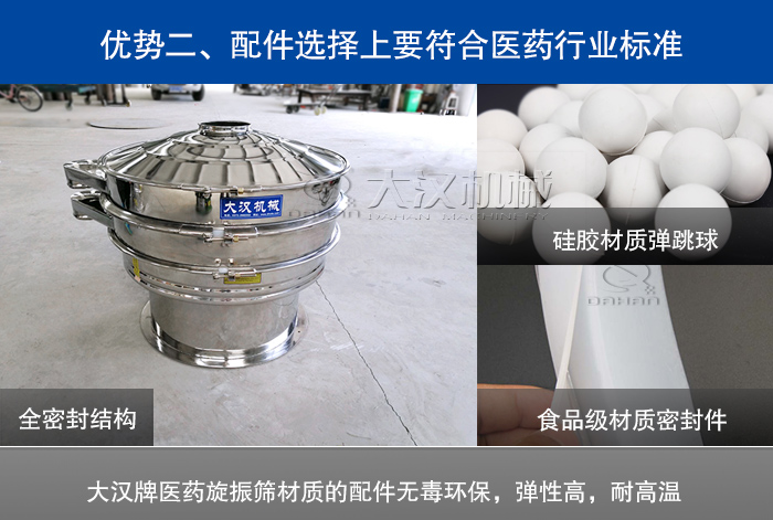 對于醫(yī)藥行業(yè)的旋振篩配件選擇上是需要特別謹慎的,大漢牌醫(yī)藥旋振篩在設(shè)備密封件,彈跳球選擇上需要選取優(yōu)質(zhì)的無污染硅膠材質(zhì),此類材質(zhì)的配件更安全,彈性高,耐高溫,符合醫(yī)藥行業(yè)的衛(wèi)生標準。