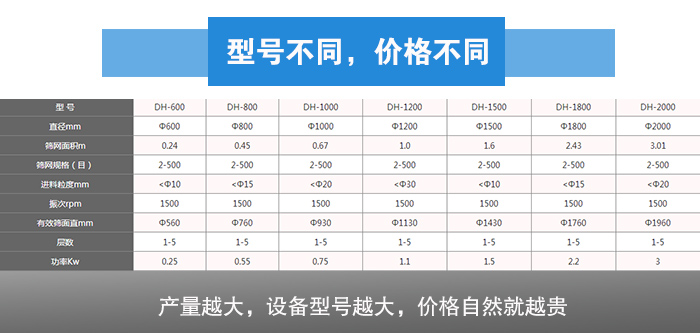 用戶對(duì)于面粉篩分產(chǎn)量的要求就決定這不銹鋼旋振篩的價(jià)格,而篩分面粉的不銹鋼旋振篩型號(hào)有DH400、DH600、DH800、DH1000、DH1200、DH1500、DH1800、DH2000等,不同型號(hào)的不銹鋼旋振篩對(duì)應(yīng)的產(chǎn)量是不同的,如果面粉的產(chǎn)量在500kg/h及以下就可以選擇DH400、DH600不銹鋼旋振篩,每小時(shí)產(chǎn)量在500-1200kg之間需要選擇DH800、DH1000、DH1200等型號(hào),產(chǎn)量越大,設(shè)備型號(hào)越大,價(jià)格自然就越貴。