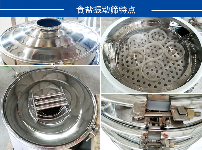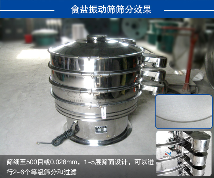大漢食鹽振動篩細至500目或0.028mm,1~5層篩面設(shè)計,可以進行2~6個等級篩分和過濾,保證了食鹽振動篩的篩分量,并且大漢食鹽振動篩整機采用304不銹鋼材質(zhì),振動篩密封件材質(zhì)要選擇硅膠材質(zhì),可以保證食鹽在篩分過程中不被污染,進一步提高了食鹽的篩分精度。